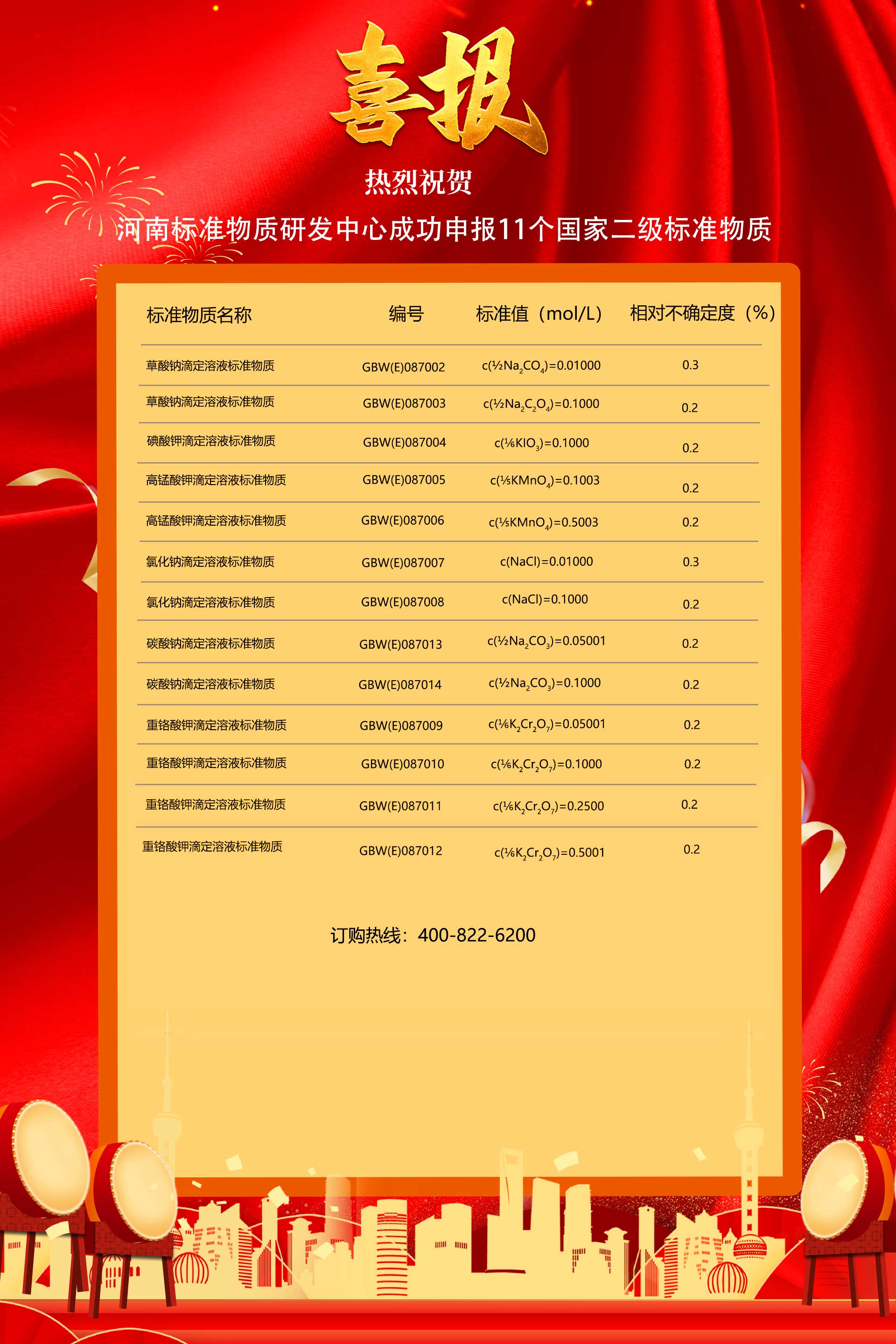 河南标准物质研发中心 成功申报13个国家二级标准物质包括:草酸钠滴定溶液、碘酸钾滴定溶液、高锰酸钾滴定溶液、氯化钠滴定溶液、碳酸钠滴定溶液、重铬酸钾滴定溶液